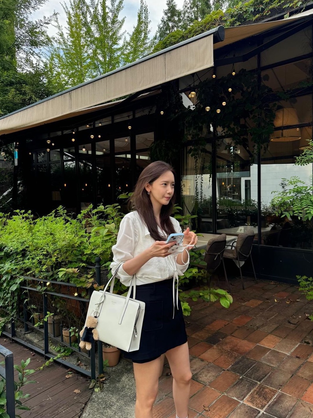 윤아 스타일링 너무 여성스러우면서 이쁘네요. 심플하고 여성스러운게 정말 더 고급스러운거 같아요. 윤아는 화이트색상의 셔츠 블라우스에 블랙 숏팬츠를 매치하고 프라다 가방을 매치했습니다. 그리고 블랙 로퍼를 신고 양말을 신어 줬네요.
